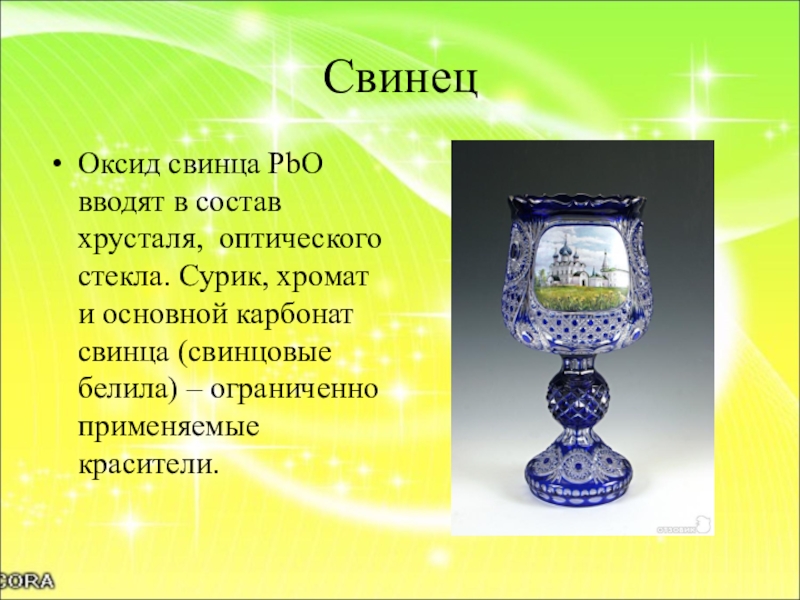 Оксид свинца PbO вводят в состав хрусталя, оптического стекла. Сурик, хромат