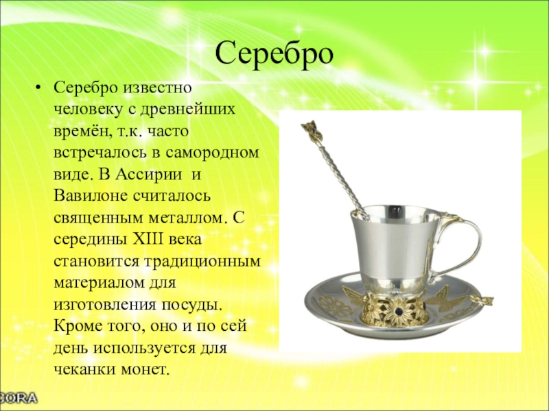 виде. В Ассирии и Вавилоне считалось священным металлом. С середины XIII века становится традиционным материалом для изготовления посуды. Кроме того, оно и по сей день используется для чеканки монет.