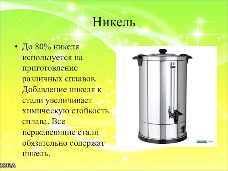 До 80% никеля используется на приготовление различных сплавов. Добавление никеля к