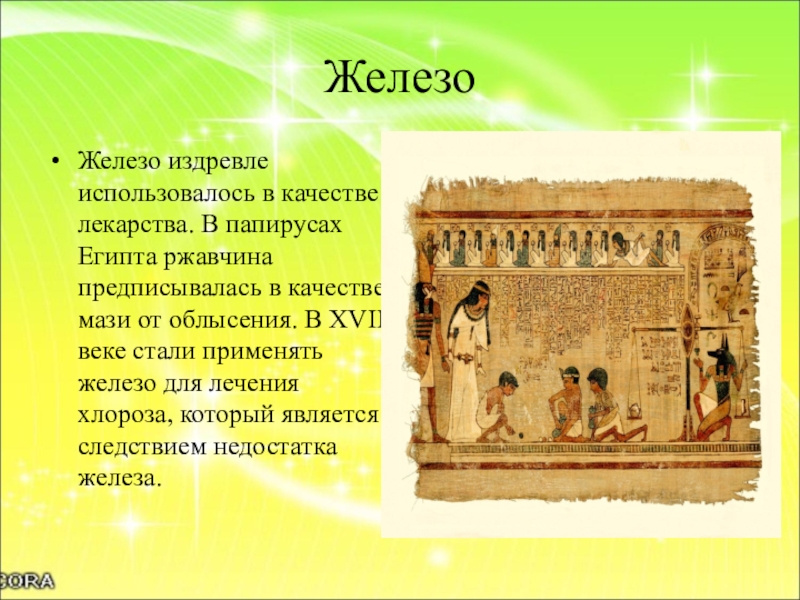 Железо издревле использовалось в качестве лекарства. В папирусах Египта ржавчина предписывалась