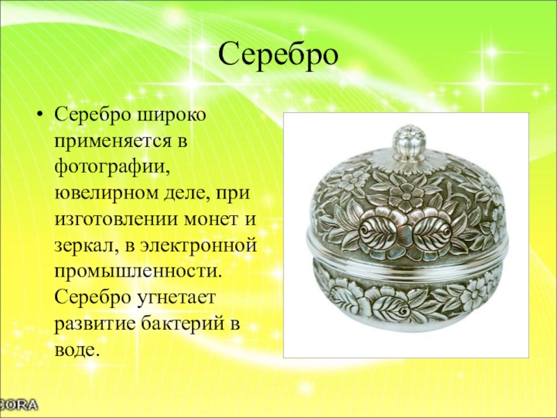 зеркал, в электронной промышленности. Серебро угнетает развитие бактерий в воде.