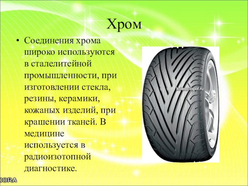 Соединения хрома широко используются в сталелитейной промышленности, при изготовлении стекла, резины,