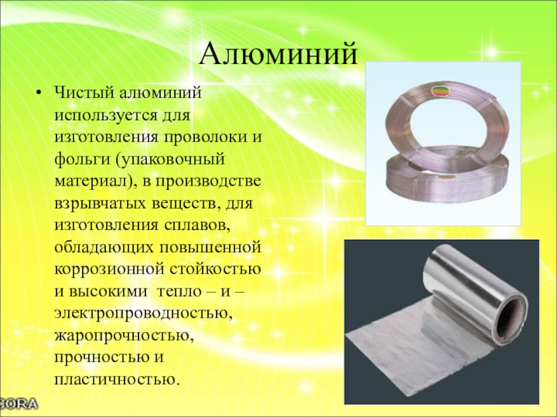 Чистый алюминий используется для изготовления проволоки и фольги (упаковочный материал), в