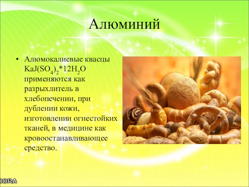 Алюмокалиевые квасцы KaJ(SO4)2*12H2O применяются как разрыхлитель в хлебопечении, при дублении кожи,