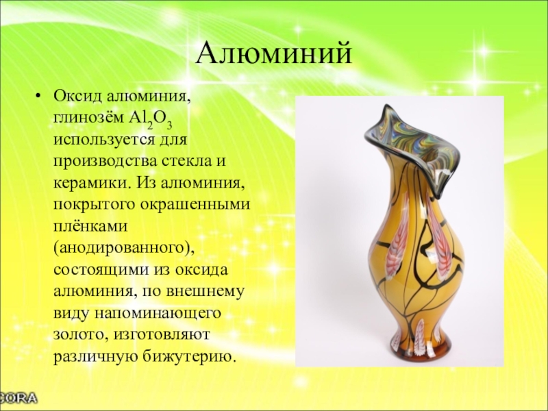 Оксид алюминия, глинозём Аl2O3 используется для производства стекла и керамики. Из