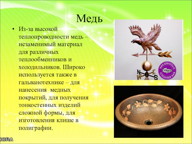 Из-за высокой теплопроводности медь – незаменимый материал для различных теплообменников и холодильников. Широко используется также в гальванотехнике – для нанесения медных покрытий, для получения тонкостенных изделий сложной формы, для изготовления клише в полиграфии.