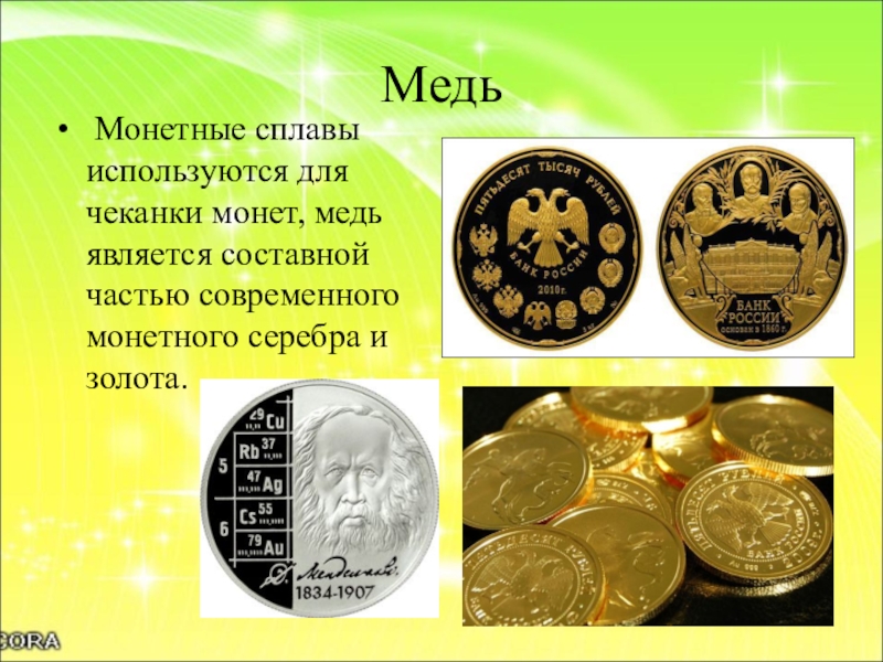 Монетные сплавы используются для чеканки монет, медь является составной частью