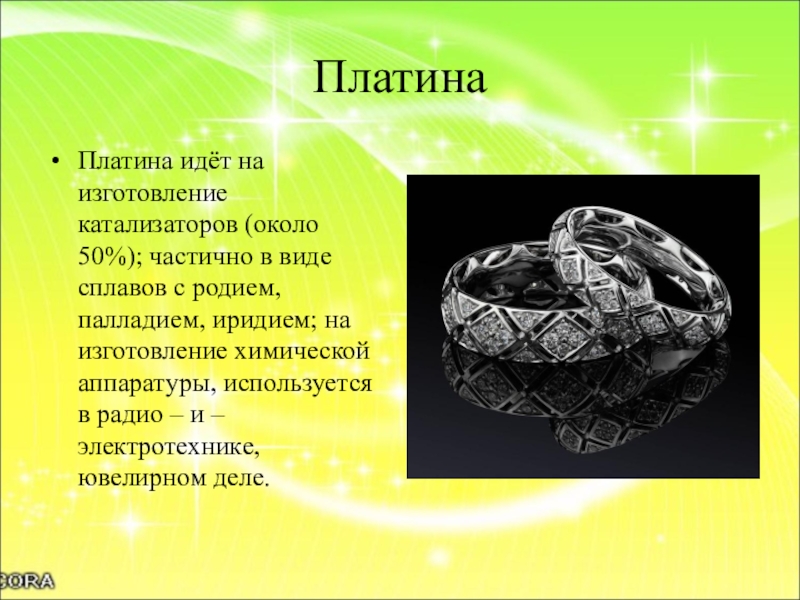 с родием, палладием, иридием; на изготовление химической аппаратуры, используется в радио – и –электротехнике, ювелирном деле.