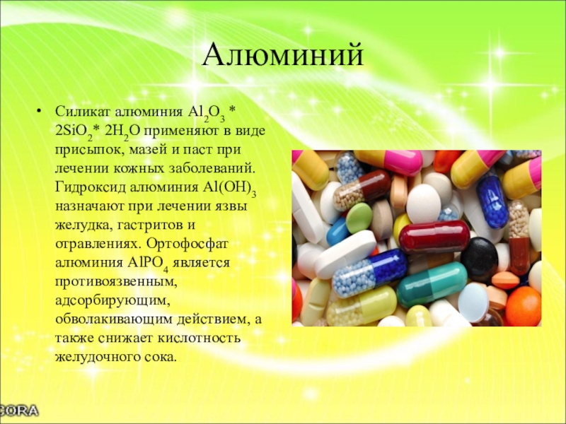 и паст при лечении кожных заболеваний. Гидроксид алюминия Al(OH)3 назначают при лечении язвы желудка, гастритов и отравлениях. Ортофосфат алюминия AlPO4 является противоязвенным, адсорбирующим, обволакивающим действием, а также снижает кислотность желудочного сока.