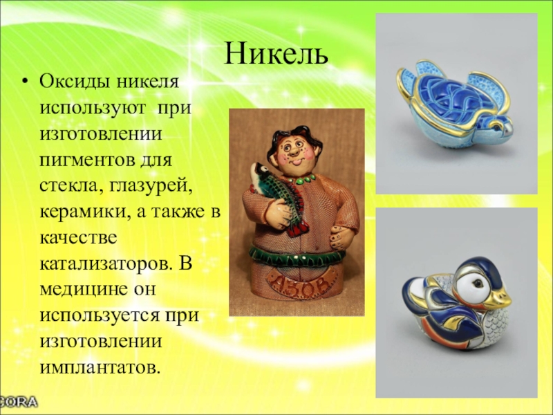 Оксиды никеля используют при изготовлении пигментов для стекла, глазурей, керамики, а