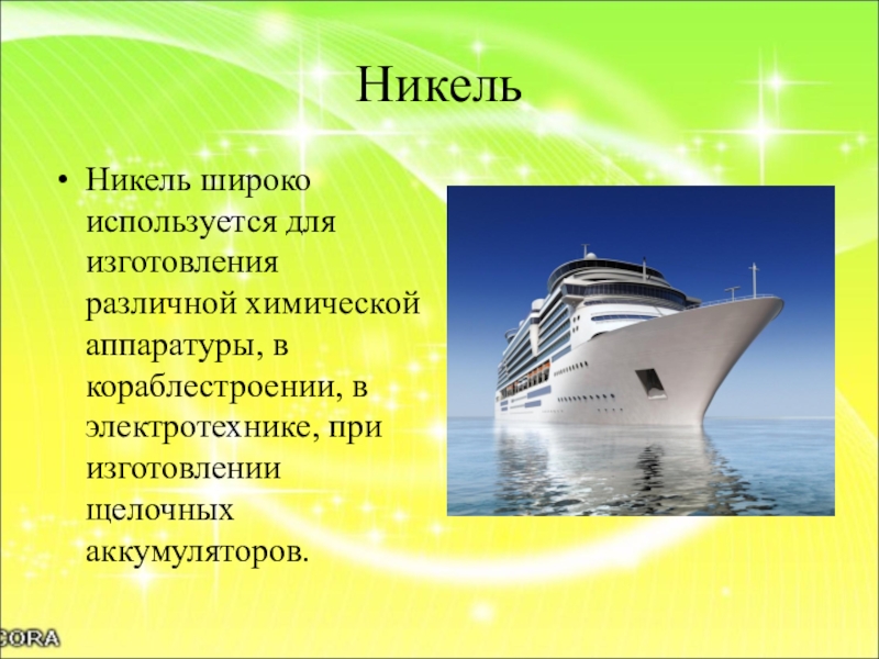Никель широко используется для изготовления различной химической аппаратуры, в кораблестроении, в