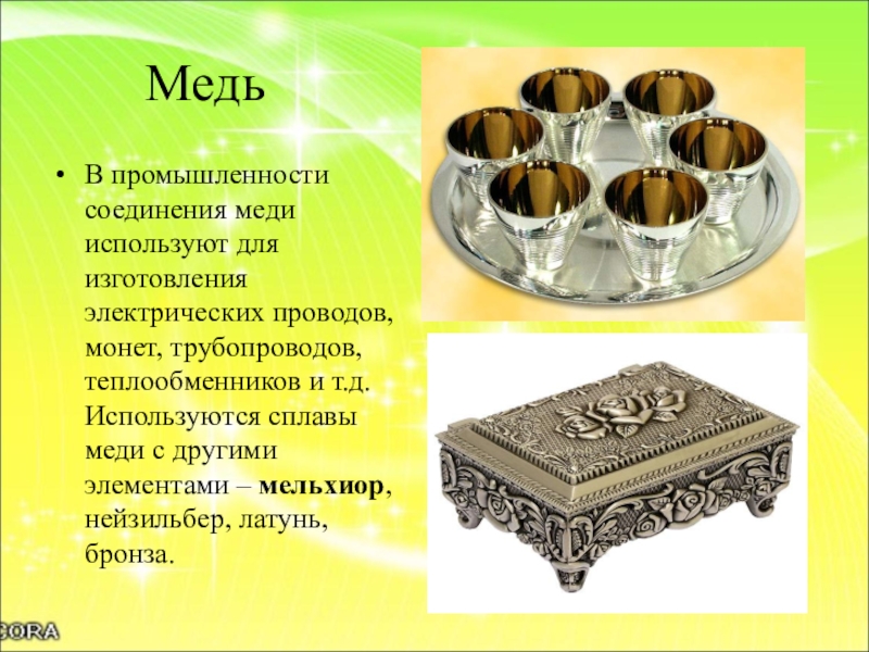 электрических проводов, монет, трубопроводов, теплообменников и т.д. Используются сплавы меди с другими элементами – мельхиор, нейзильбер, латунь, бронза.