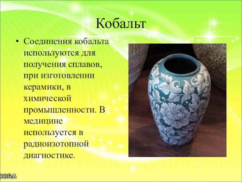 Соединения кобальта используются для получения сплавов, при изготовлении керамики, в химической