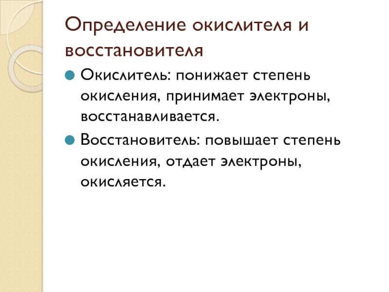 Определение окислителя и восстановителяОкислитель: понижает степень окисления, принимает электроны, восстанавливается.Восстановитель: повышает степень окисления, отдает электроны, окисляется.