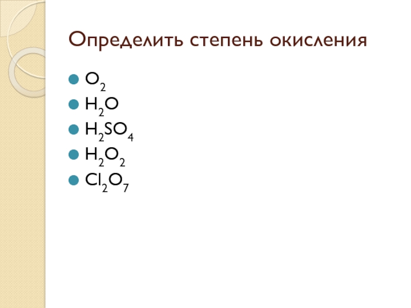 Определить степень окисленияO2H2OH2SO4H2O2Cl2O7