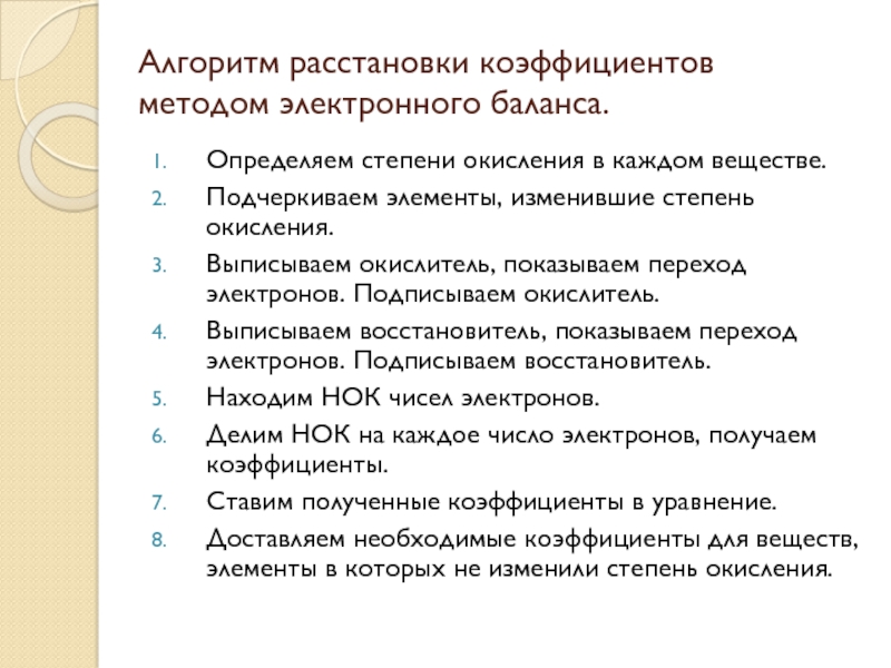 Слайд 5Алгоритм расстановки коэффициентов методом электронного баланса.