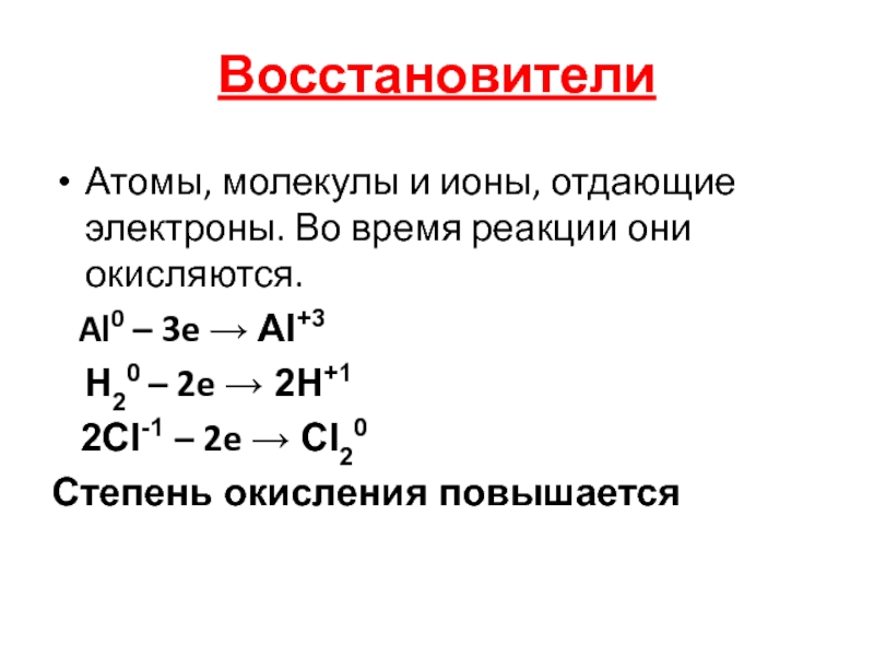 Атомы, молекулы и ионы, отдающие электроны. Во время реакции они окисляются.