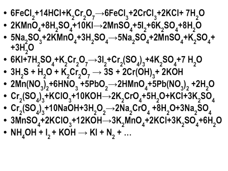 Слайд 18KI + H2SO4 + K2Cr2O7 → I2 + Cr2(SO4)3 + …