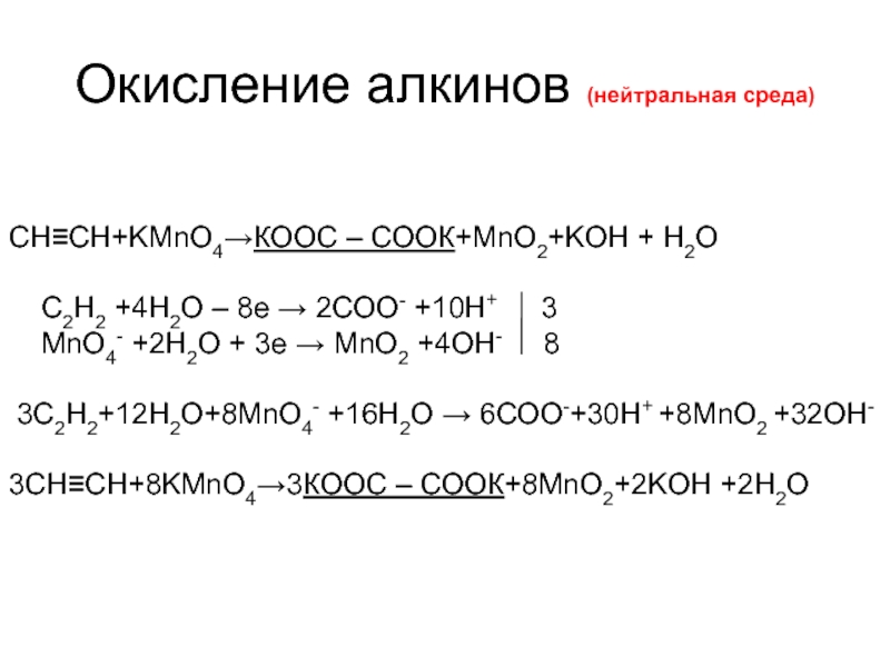 CH3–CОН + 2KMnO4 +3KOH →СН3СОOK+ 2K2MnO4 +2H2O