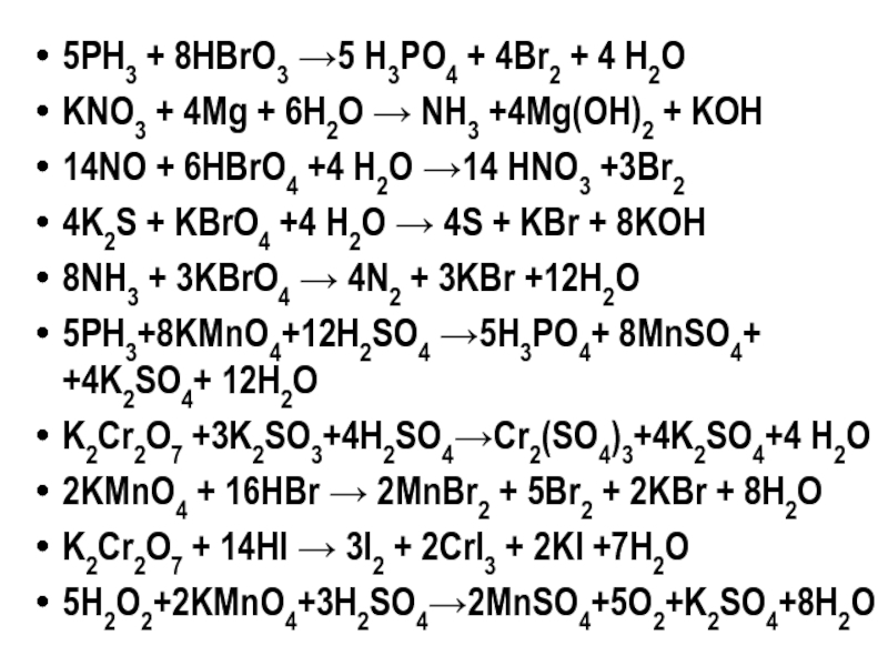 Слайд 595PH3 + 8НBrO3 →5 H3PO4 + 4Br2 + 4 H2O