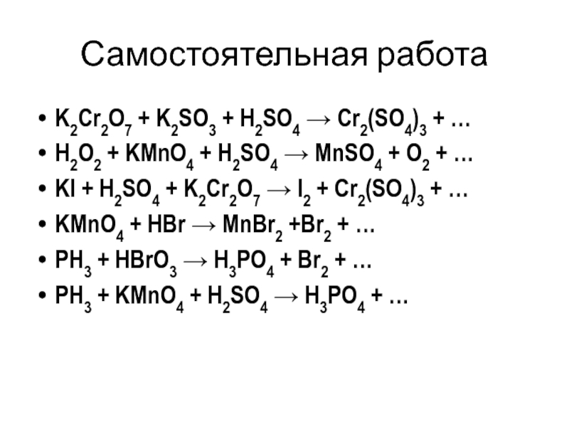 Слайд 17H2O2 + KMnO4 + H2SO4 → MnSO4 + O2 + …