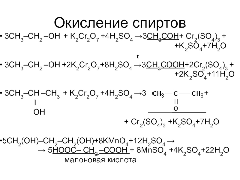 3CH3–CH2 –ОН +2K2Cr2O7+8H2SO4 →3СН3СОOН+2Cr2(SO4)3 +