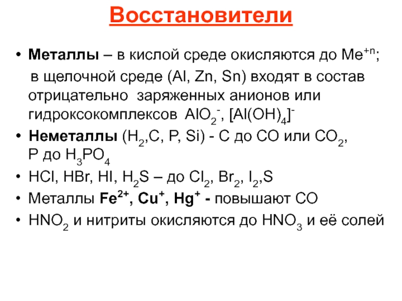 среде (Al, Zn, Sn) входят в состав отрицательно заряженных анионов или гидроксокомплексов AlO2-, [Al(OH)4]-