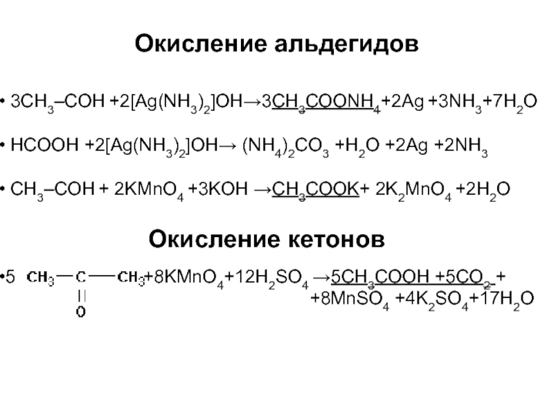 3CH3–CОН +2[Ag(NH3)2]OH→3СН3СОONH4+2Ag +3NH3+7H2O