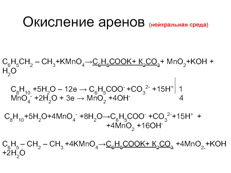С6H5СН2 – CH3+KMnO4→С6Н5СООK+ К2СО3+ MnO2+KOH + H2O