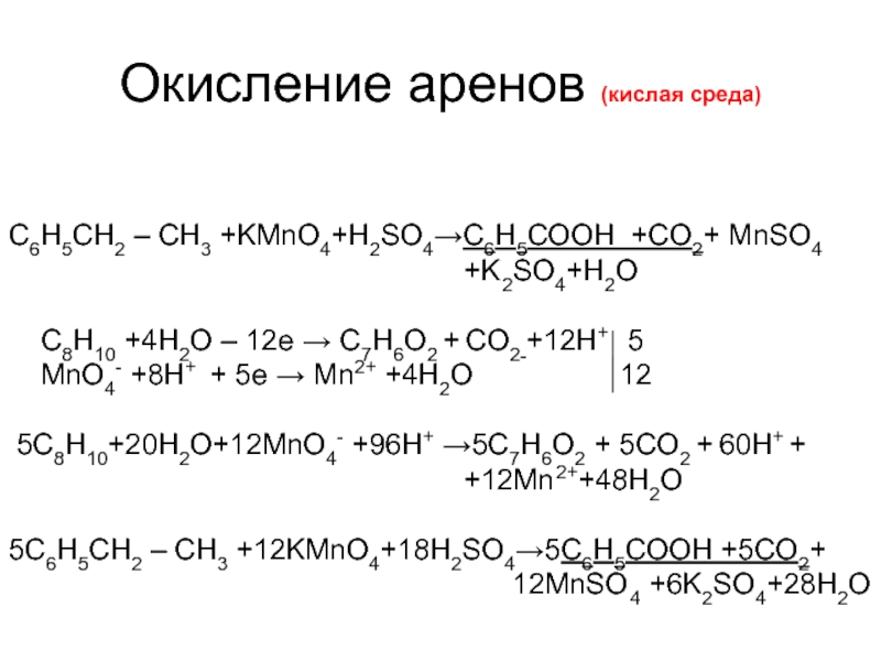 C8H10+5H2O+4MnO4- +8H2O→С6Н5СОО- +CO32-+15Н+ +