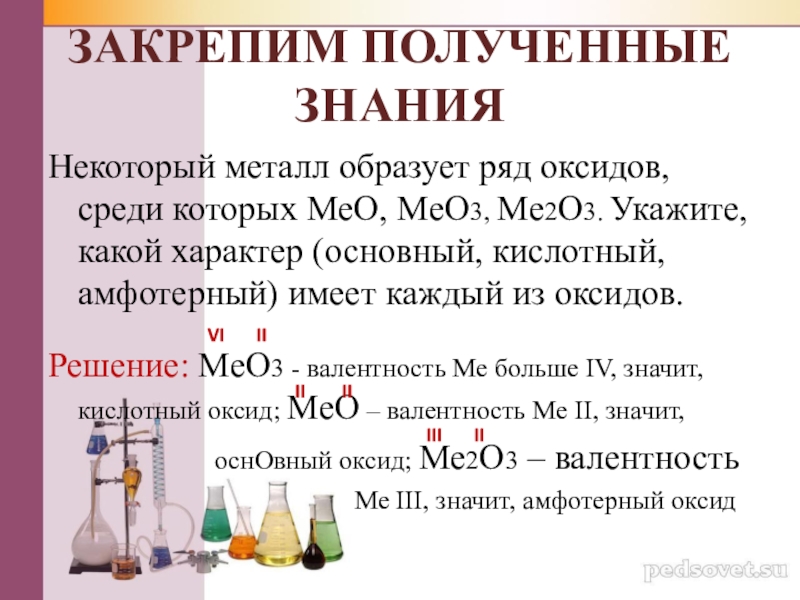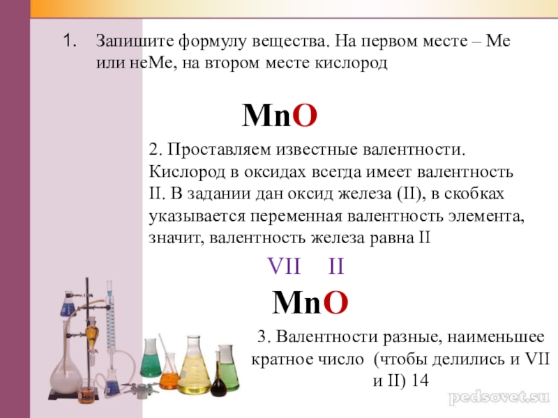 2. Проставляем известные валентности. Кислород в оксидах всегда имеет валентность II. В задании дан оксид железа (II), в скобках указывается переменная валентность элемента, значит, валентность железа равна II