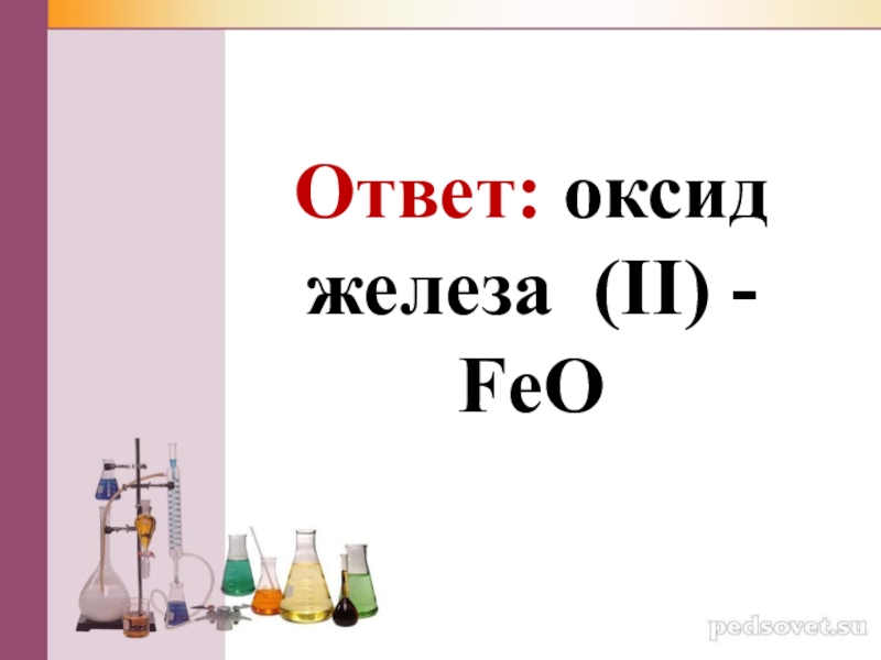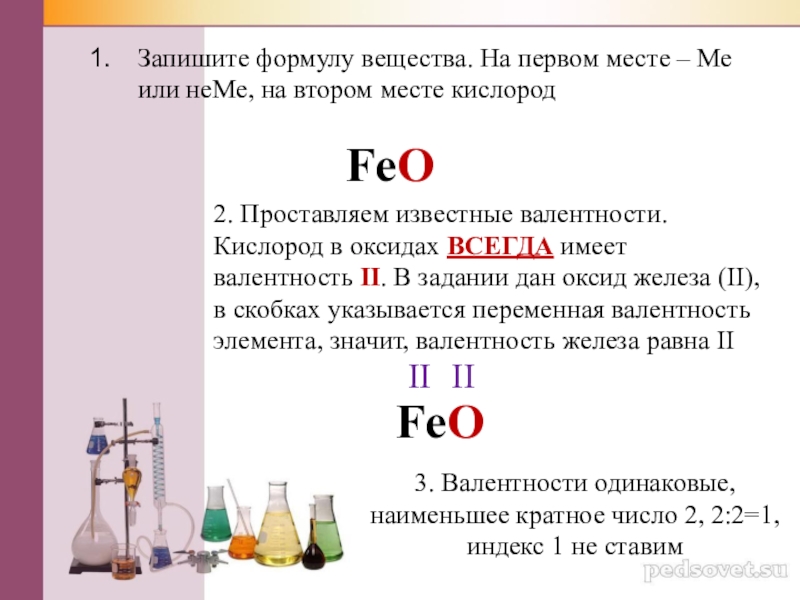 2. Проставляем известные валентности. Кислород в оксидах ВСЕГДА имеет валентность II. В задании дан оксид железа (II), в скобках указывается переменная валентность элемента, значит, валентность железа равна II