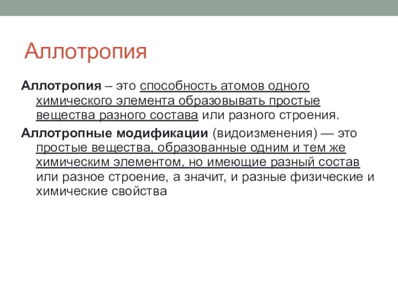 Аллотропные модификации (видоизменения) — это простые вещества, образованные одним и тем же химическим элементом, но имеющие разный состав или разное строение, а значит, и разные физические и химические свойства