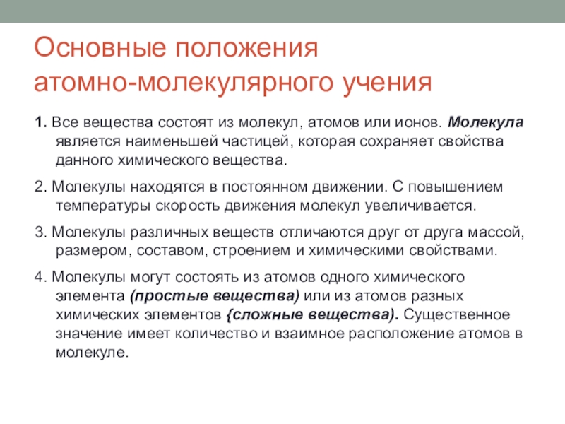 4. Молекулы могут состоять из атомов одного химического элемента (простые вещества) или из атомов разных химических элементов {сложные вещества). Существенное значение имеет количество и взаимное расположение атомов в молекуле.