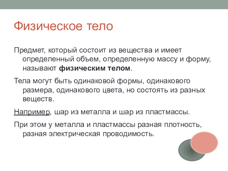 Тела могут быть одинаковой формы, одинакового размера, одинакового цвета, но состоять из разных веществ.