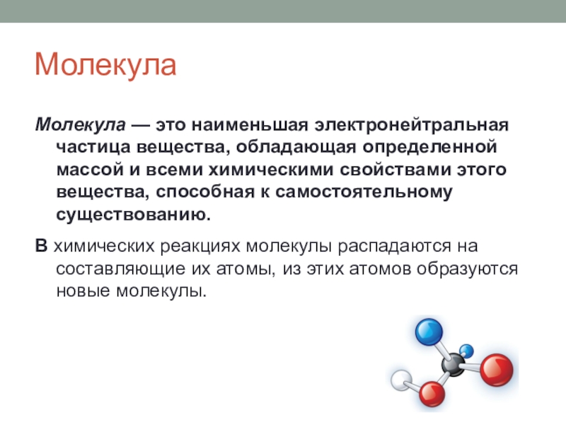 Молекула — это наименьшая электронейтральная частица вещества, обладающая определенной массой и