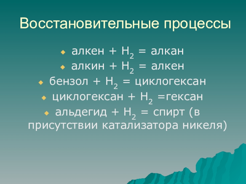 Восстановительные процессыалкен + Н2 = алканалкин + Н2 = алкенбензол + Н2 = циклогексан циклогексан + Н2