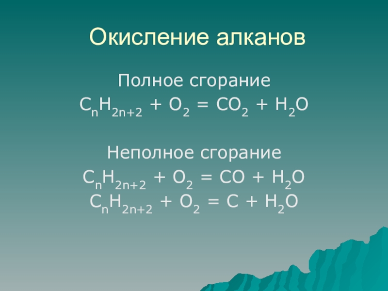 Окисление алкановПолное сгорание CnH2n+2 + O2 = CO2 + H2O Неполное сгорание CnH2n+2 + O2 = CO