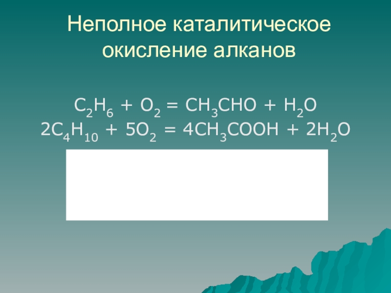 Неполное каталитическое окисление алкановC2H6 + O2 = CH3CHO + H2O2C4H10 + 5O2 = 4CH3COOH + 2H2O