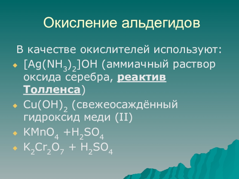Окисление альдегидовВ качестве окислителей используют:[Ag(NH3)2]OH (аммиачный раствор оксида серебра, реактив Толленса)Cu(OH)2 (свежеосаждённый гидроксид меди (II)KMnO4 +H2SO4K2Cr2O7 +