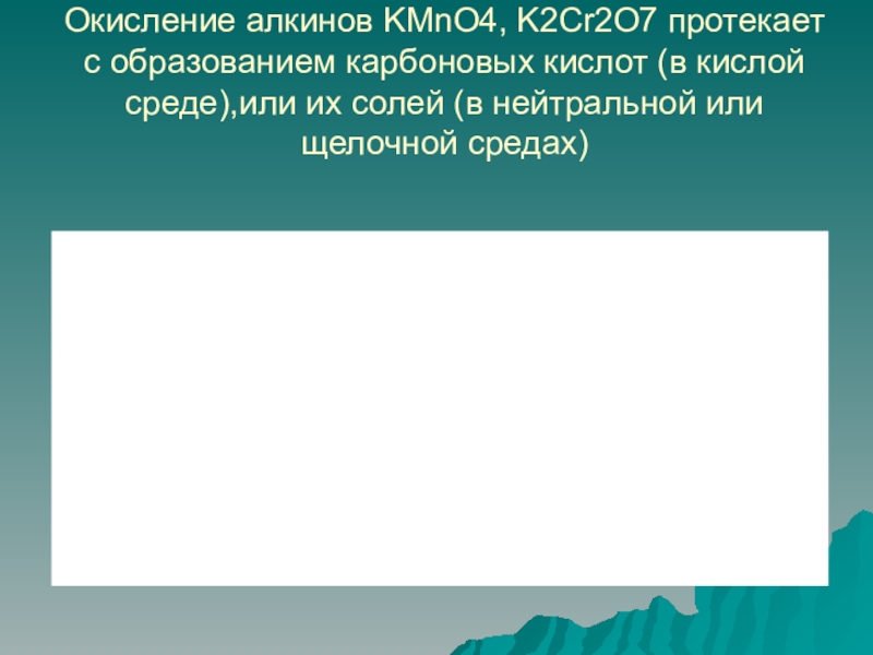 Слайд 23Окисление алкинов KMnO4, K2Cr2O7 протекает с образованием карбоновых кислот (в кислой