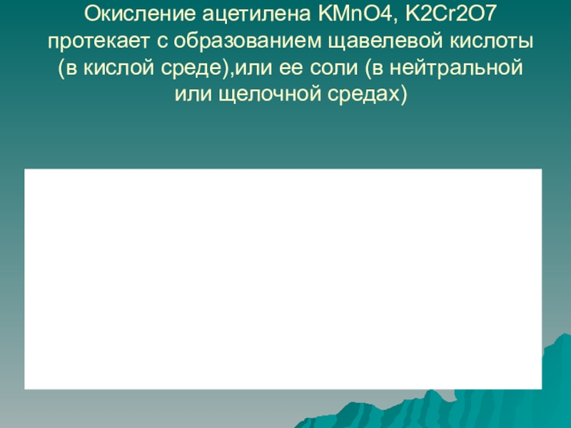 Слайд 22Окисление ацетилена KMnO4, K2Cr2O7 протекает с образованием щавелевой кислоты (в кислой