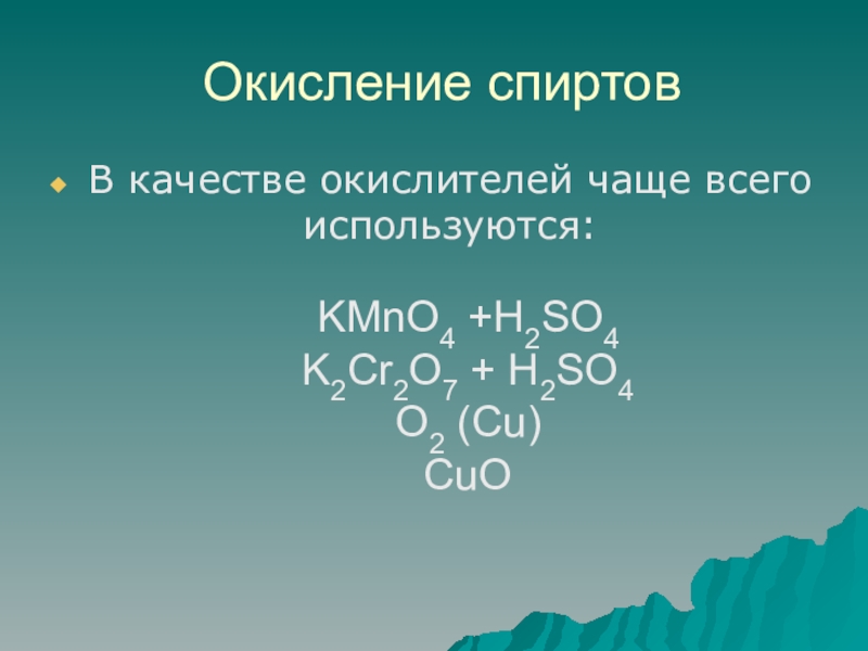 Окисление спиртовВ качестве окислителей чаще всего используются: KMnO4 +H2SO4K2Cr2O7 + H2SO4O2 (Cu)CuO