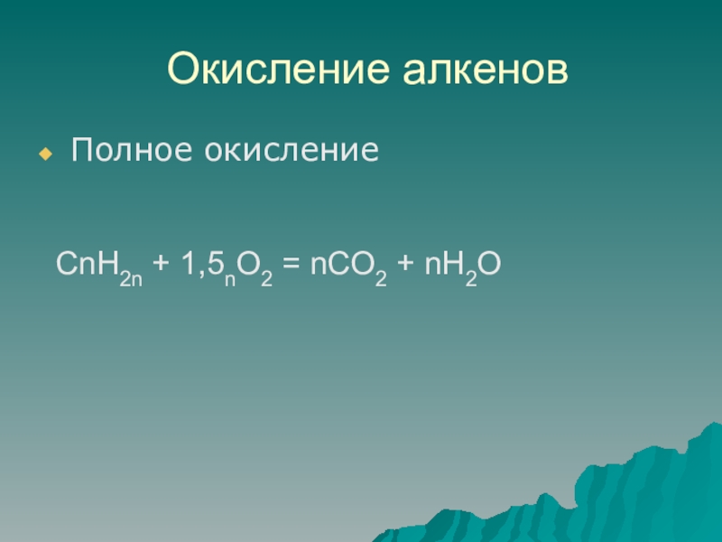 Окисление алкеновПолное окислениеCnH2n + 1,5nO2 = nCO2 + nH2O