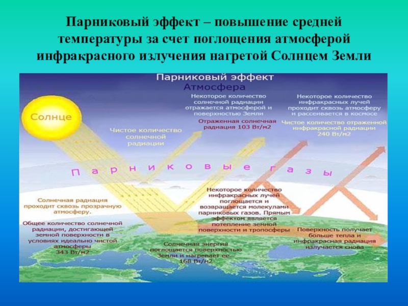 Слайд 2Парниковый эффект – повышение средней температуры за счет поглощения атмосферой инфракрасного