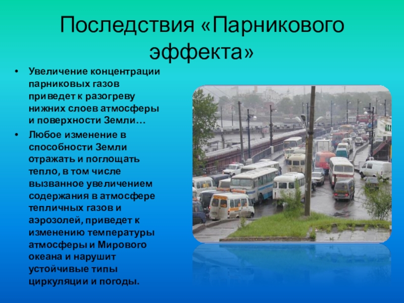 Любое изменение в способности Земли отражать и поглощать тепло, в том числе вызванное увеличением содержания в атмосфере тепличных газов и аэрозолей, приведет к изменению температуры атмосферы и Мирового океана и нарушит устойчивые типы циркуляции и погоды.