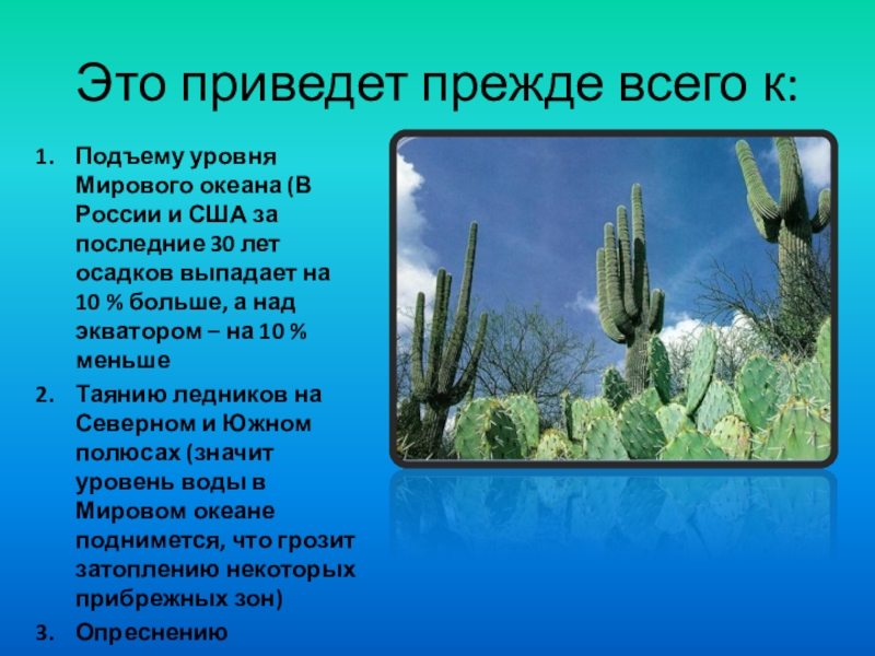 Это приведет прежде всего к:Подъему уровня Мирового океана (В России и США за последние 30 лет осадков