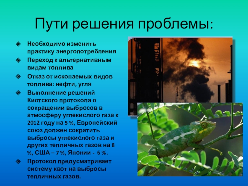 Пути решения проблемы:Необходимо изменить практику энергопотребленияПереход к альтернативным видам топливаОтказ от ископаемых видов топлива: нефти, угляВыполнение решений