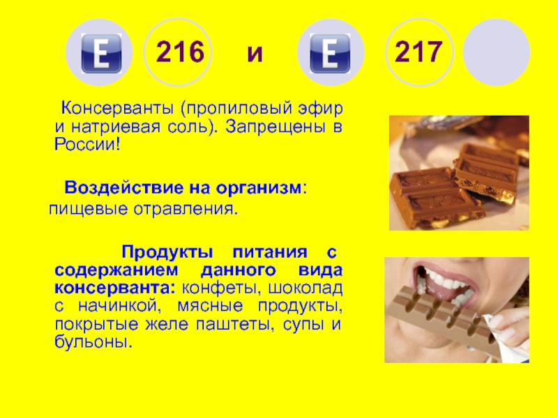 Помимо этого запрещены в Европейском Союзе, но всё еще разрешены на территории России следующие добавки: Е102, Е104, Е110, Е111, ЕТ20, Е122, Е124, Е126, Е141, Е142, Е150, Е212, Е250, Е251, Е311-313, Е477.