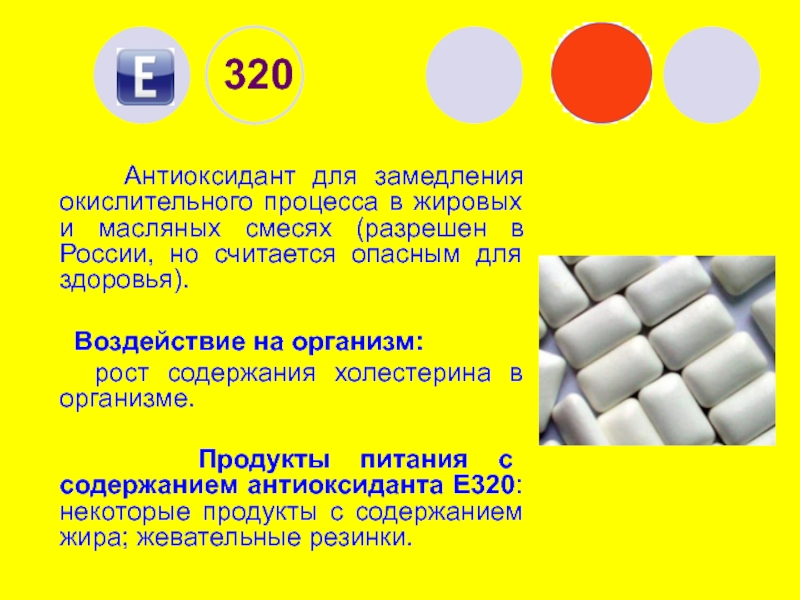 Продукты питания с содержанием антиоксиданта Е320: некоторые продукты с содержанием жира; жевательные резинки.